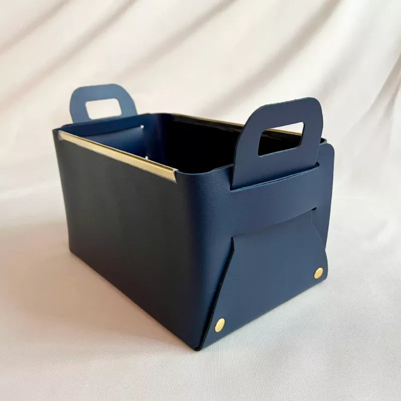 These gorgeous storage boxes can be folded down when out of use. Made from high quality vegan leather, they have amazing detail gold buttons and trim. They're a great size for your desk - perfect for books, yarn or craft supplies, or any other bits and bobs you want to hide away on your desk.